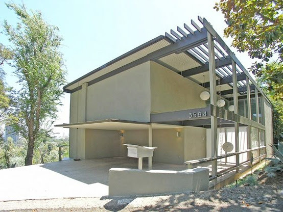 This great post modern house has 3 bedroom, 3.5 bath and sits up in the Hollywood Hills, off Mullholland Dr. Its design amazingly use awesome city views around. It also utilizes plenty of “green” technologies like using recycled glass, recycled marble, cork flooring and so on. The entrance to the main level, is through an enclosed private courtyard. The great room is comprised of the living room, dining room, and kitchen. The main feature here is a floating fireplace that could be rotated completely. The kitchen features all possible appliances that could be needed to cook a perfect meal. There is even the B-B-Q on the deck that runs the length of the great room and separate attached office, with built in desk and file cabinets. The lower level has media room completed with a Jacuzzi. There is a central sound system wired throughout the house and outdoor decks. One of the desks also features another Jacuzzi to relax on the fresh air.